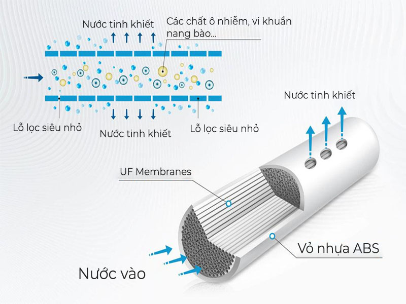 Công nghệ UF (Ultrafiltration - Siêu lọc) sử dụng màng lọc có kích thước lỗ lớn hơn RO nhưng nhỏ hơn Nano, giúp loại bỏ vi khuẩn, tạp chất mà vẫn giữ lại khoáng chất tự nhiên. Máy lọc nước UF không sử dụng điện và không có nước thải, phù hợp cho nguồn nước có độ sạch tương đối. Tuy nhiên, nếu nguồn nước bị ô nhiễm nặng, công nghệ này có thể không đảm bảo hiệu quả lọc tối ưu.