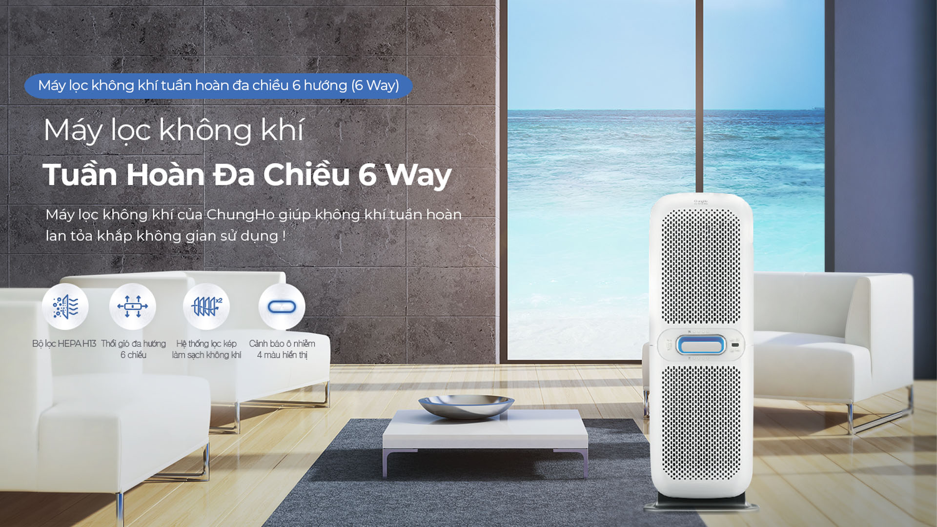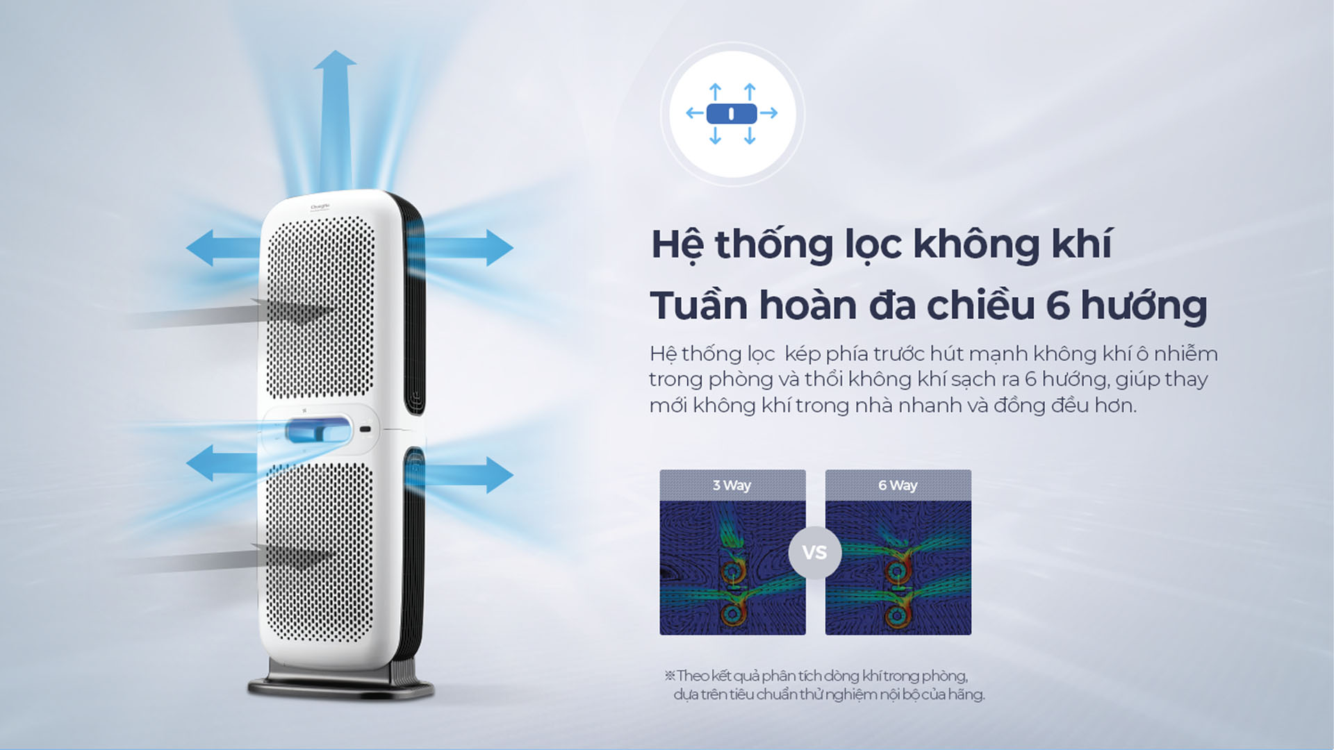 Thiết kế 6-Way đa chiều cho phép không khí được hút và lọc từ nhiều hướng, mang lại hiệu quả làm sạch nhanh chóng và mạnh mẽ hơn so với các thiết bị thông thường. Điều này giúp cải thiện luồng không khí trong phòng và đảm bảo không gian luôn được tươi mới.
