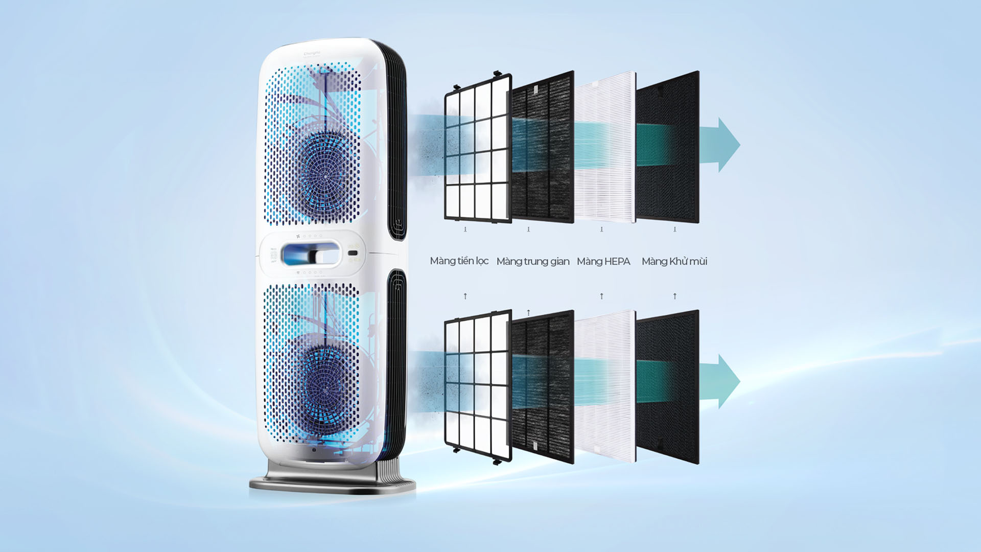 Hệ thống lọc kép với thiết kế 6-way đa chiều giúp tăng cường khả năng lọc sạch không khí nhanh chóng, đảm bảo không gian sống luôn trong lành.