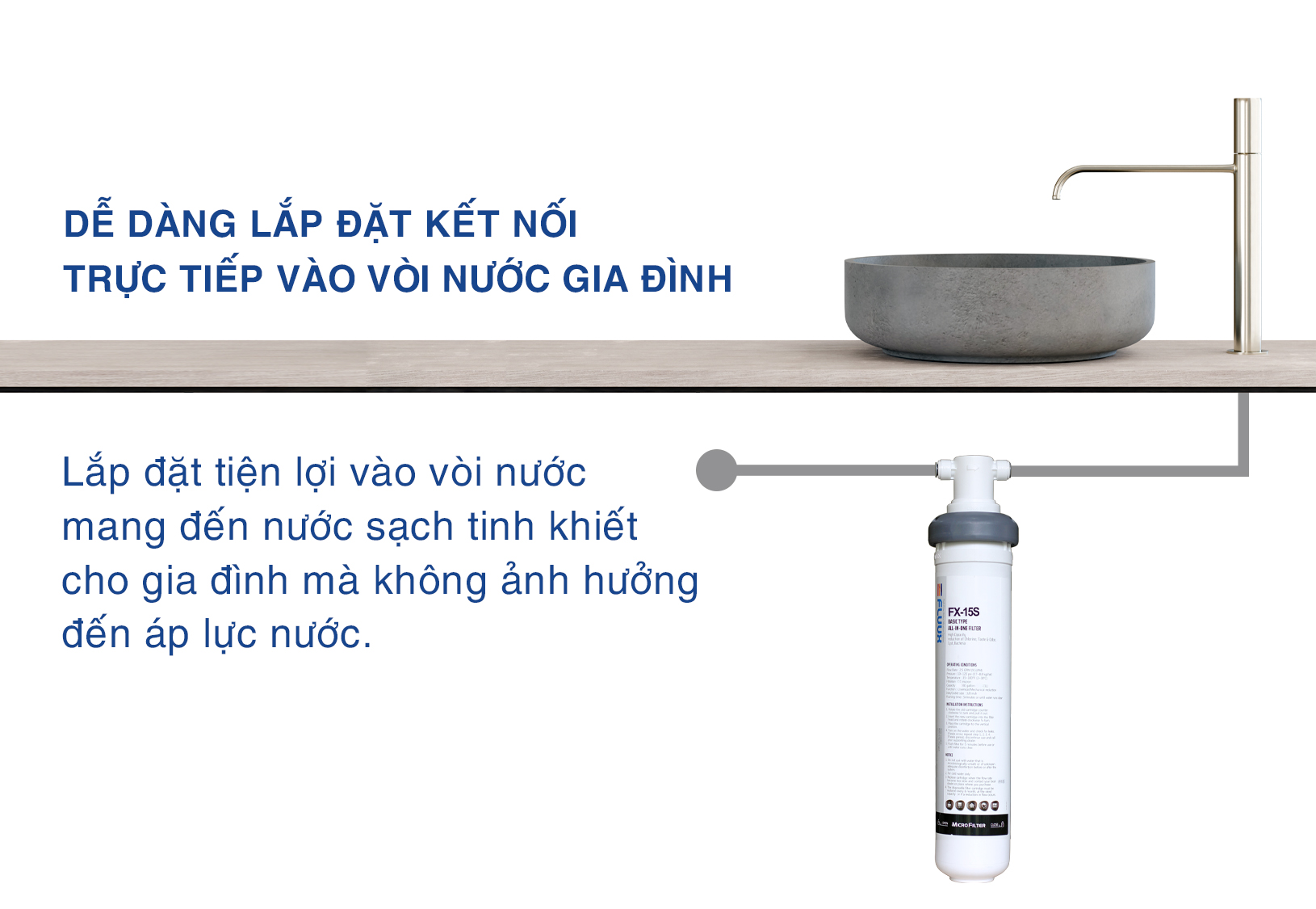 - Thiết bị dễ dàng lắp đặt trực tiếp vào các vòi nước gia đình, chậu rửa mà không làm giảm áp lực nước. Với thiết kế phù hợp, FLUUX FX15S thích hợp cho thiết bị lọc nước đầu nguồn gia đình và không yêu cầu kỹ thuật phức tạp khi lắp đặt.