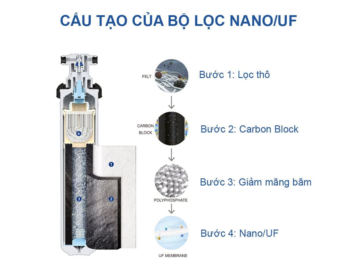 Công nghệ UF sử dụng màng lọc với kích thước lỗ từ 0.1 đến 0.001 micron, đủ nhỏ để loại bỏ vi khuẩn, môt số loại vi rút và các hạt lớn mà không cần dùng đến điện. Màng lọc sơi rỗng Nano/UF giữ lại các khoáng chất tự nhiên trong nước, đảm bảo nguồn nước có độ sạch cần thiết.